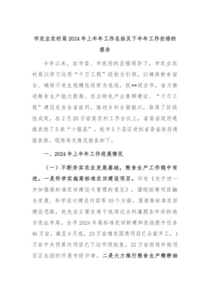【七哥公文】2024年:市农业农村局2024年上半年工作总结及下半年工作安排的报告+更多免费公文+VX:QiGeGongWen2024