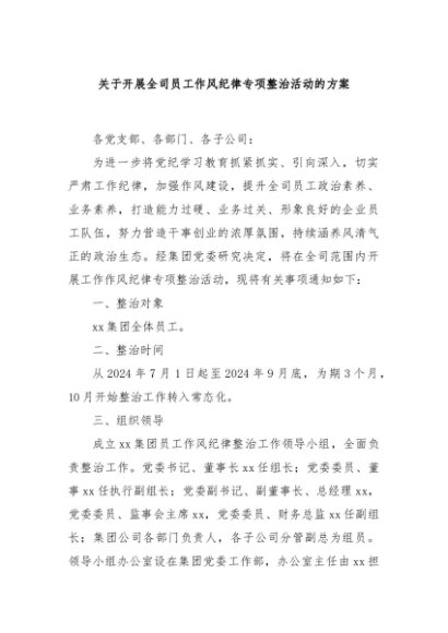 / 【七哥公文】2024年:关于开展全司员工作风纪律专项整治活动的方案+更多免费公文+VX:QiGeGongWen2024