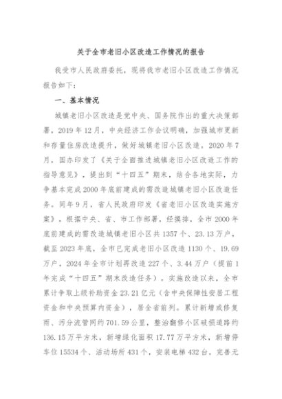 / 【七哥公文】2024年:关于全市老旧小区改造工作情况的报告+更多免费公文+VX:QiGeGongWen2024