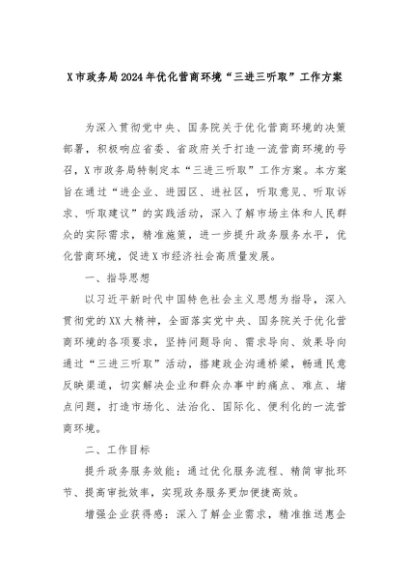 【七哥公文】2024年:X市政务局2024年优化营商环境“三进三听取”工作方案+更多免费公文+VX:QiGeGongWen2024