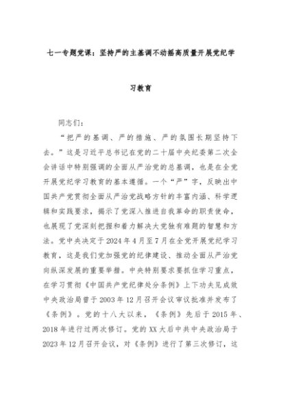 【七哥公文】2024年:七一专题党课:坚持严的主基调不动摇高质量开展党纪学习教育+更多免费公文+VX:QiGeGongWen2024