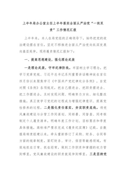 【七哥公文】2024年:上半年局办公室主任上半年落实全面从严治党“一岗双责”工作情况汇报+更多免费公文+VX:QiGeGongWen2024