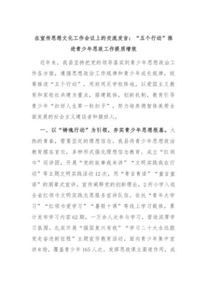 【七哥公文】2024年:在宣传思想文化工作会议上的交流发言:“五个行动”推进青少年思政工作提质增效+更多免费公文+VX:QiGeGongWen2024