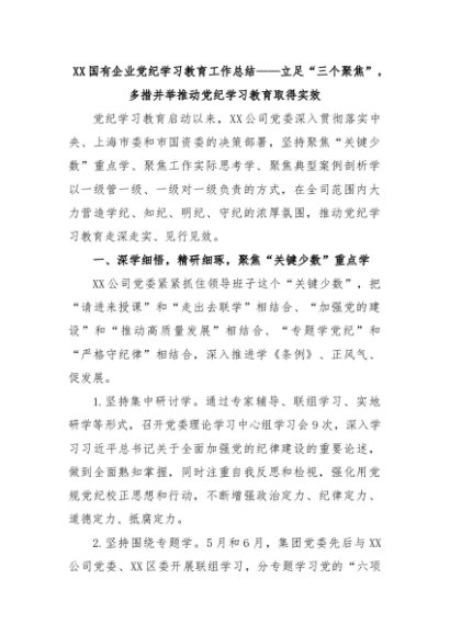 【七哥公文】2024年:XX国有企业党纪学习教育工作总结——立足“三个聚焦”,多措并举推动党纪学习教育取得实效+更多免费公文+VX:QiGeGongWen2024
