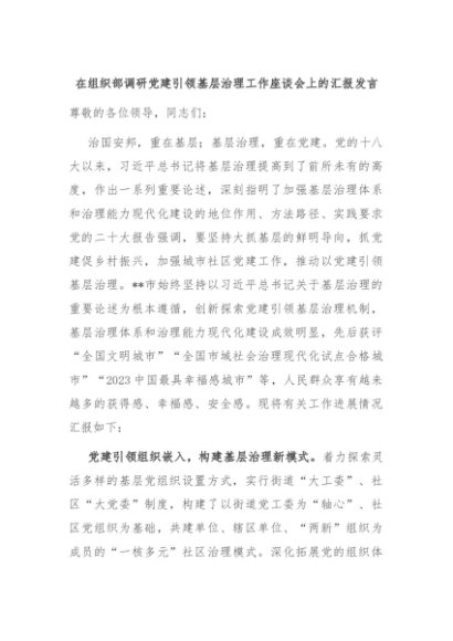 【七哥公文】2024年:在组织部调研党建引领基层治理工作座谈会上的汇报发言+更多免费公文+VX:QiGeGongWen2024