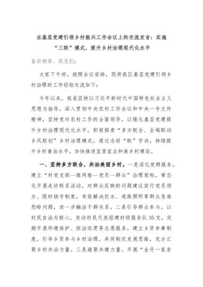【七哥公文】2024年:在基层党建引领乡村振兴工作会议上的交流发言:实施“三联”模式,提升乡村治理现代化水平+更多免费公文+VX:QiGeGongWen2024