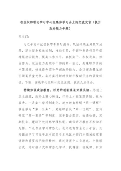 【七哥公文】2024年:在组织部理论学习中心组集体学习会上的交流发言(提升政治能力专题)+更多免费公文+VX:QiGeGongWen2024
