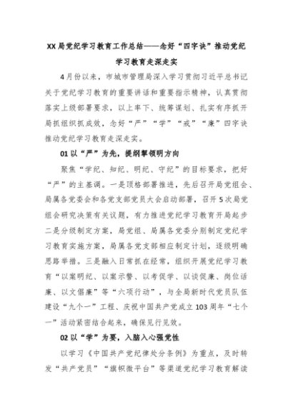 【七哥公文】2024年:XX局党纪学习教育工作总结——念好“四字诀”推动党纪学习教育走深走实+更多免费公文+VX:QiGeGongWen2024