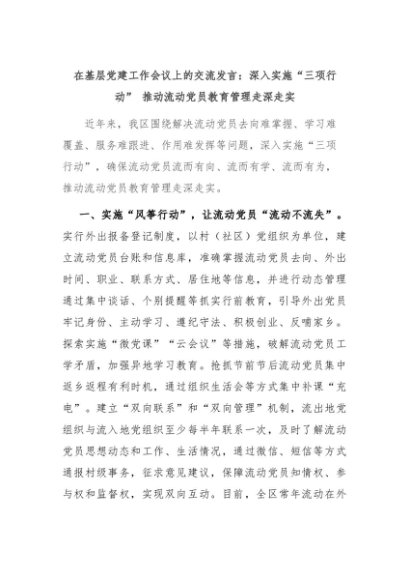 【七哥公文】2024年:在基层党建工作会议上的交流发言:深入实施“三项行动” 推动流动党员教育管理走深走实+更多免费公文+VX:QiGeGongWen2024