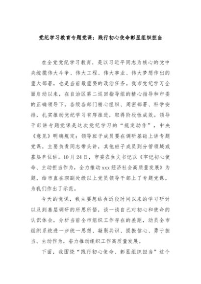 【七哥公文】2024年:党纪学习教育专题党课:践行初心使命彰显组织担当+更多免费公文+VX:QiGeGongWen2024