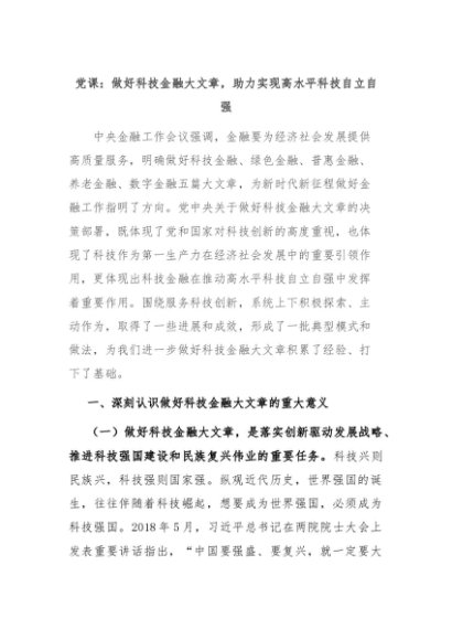 【七哥公文】2024年:党课:做好科技金融大文章,助力实现高水平科技自立自强+更多免费公文+VX:QiGeGongWen2024