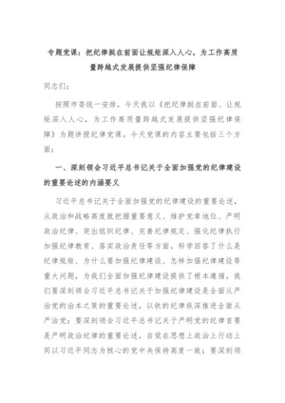 【七哥公文】2024年:专题党课:把纪律挺在前面让规矩深入人心,为工作高质量跨越式发展提供坚强纪律保障+更多免费公文+VX:QiGeGongWen2024