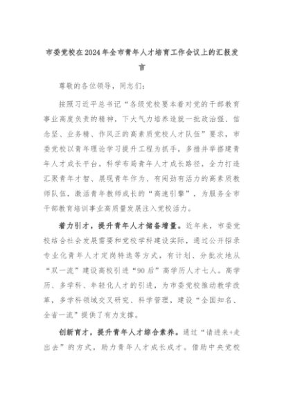 【七哥公文】2024年:市委党校在2024年全市青年人才培育工作会议上的汇报发言+更多免费公文+VX:QiGeGongWen2024