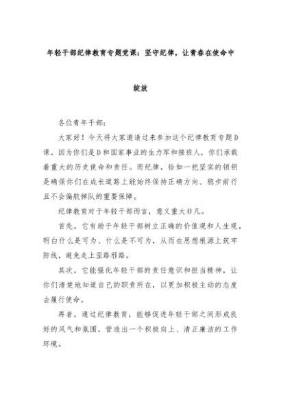 【七哥公文】2024年:年轻干部纪律教育专题党课:坚守纪律,让青春在使命中绽放+更多免费公文+VX:QiGeGongWen2024