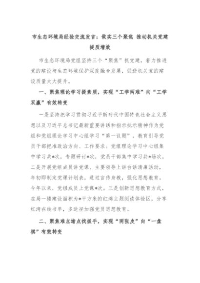 【七哥公文】2024年:市生态环境局经验交流发言:做实三个聚焦 推动机关党建提质增效+更多免费公文+VX:QiGeGongWen2024