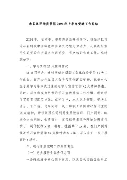 / 【七哥公文】2024年:水务集团党委书记2024年上半年党建工作总结+更多免费公文+VX:QiGeGongWen2024