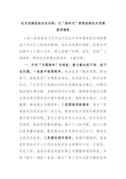 【七哥公文】2024年:机关党建经验发言材料:以“清单式”管理助推机关党建提质增效+更多免费公文+VX:QiGeGongWen2024