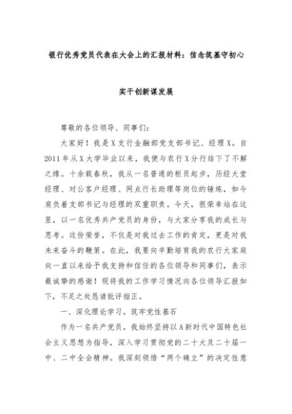 【七哥公文】2024年:银行优秀党员代表在大会上的汇报材料:信念筑基守初心实干创新谋发展+更多免费公文+VX:QiGeGongWen2024