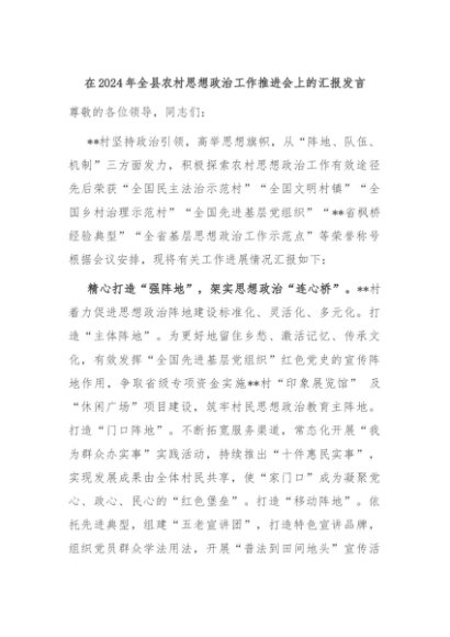 【七哥公文】2024年:在2024年全县农村思想政治工作推进会上的汇报发言+更多免费公文+VX:QiGeGongWen2024