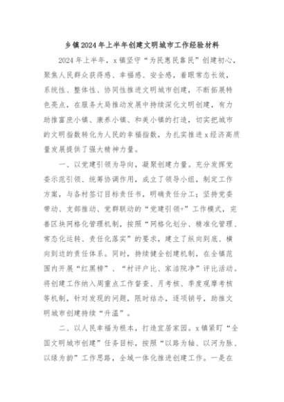 / 【七哥公文】2024年:乡镇2024年上半年创建文明城市工作经验材料+更多免费公文+VX:QiGeGongWen2024