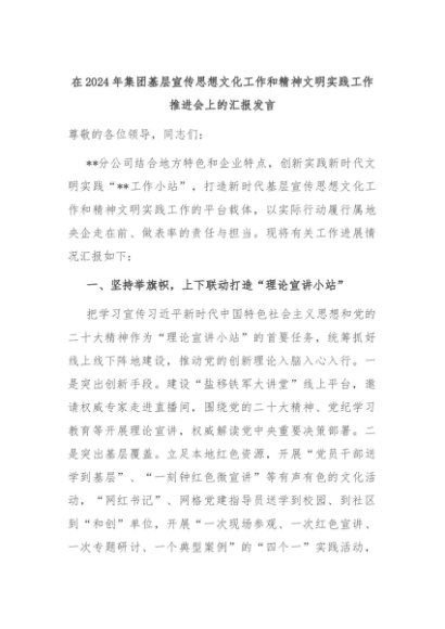 【七哥公文】2024年:在2024年集团基层宣传思想文化工作和精神文明实践工作推进会上的汇报发言+更多免费公文+VX:QiGeGongWen2024