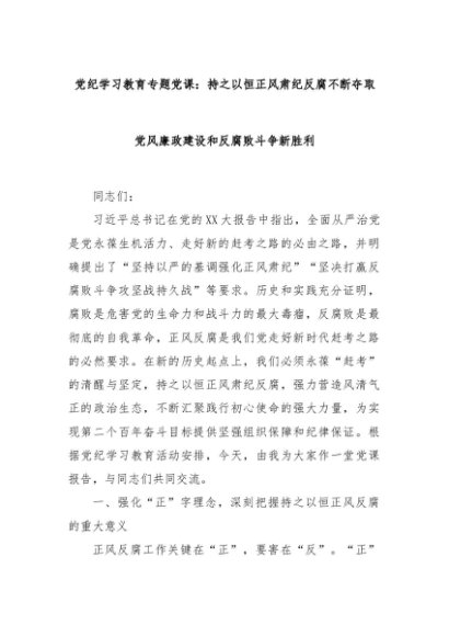 【七哥公文】2024年:党纪学习教育专题党课:持之以恒正风肃纪反腐不断夺取党风廉政建设和反腐败斗争新胜利+更多免费公文+VX:QiGeGongWen2024