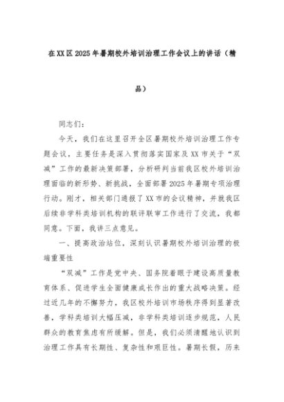【七哥公文】2025年:在XX区2025年暑期校外培训治理工作会议上的讲话(精品)+更多免费公文+VX:QiGeGongWen2024