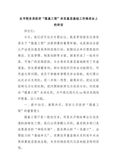 【七哥公文】2025年:在市税务局抓好“强基工程”夯实基层基础工作推进会上的讲话+更多免费公文+VX:QiGeGongWen2024