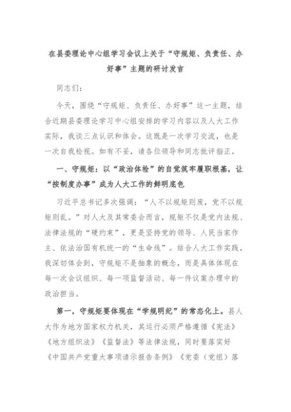 【七哥公文】2025年:在县委理论中心组学习会议上关于“守规矩、负责任、办好事”主题的研讨发言+更多免费公文+VX:QiGeGongWen2024