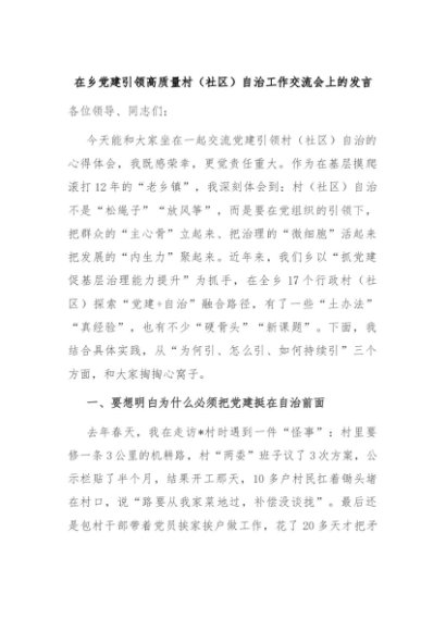【七哥公文】2025年:在乡党建引领高质量村(社区)自治工作交流会上的发言+更多免费公文+VX:QiGeGongWen2024