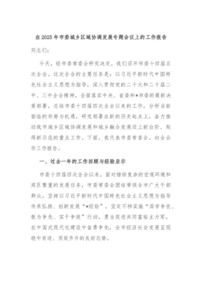 【七哥公文】2025年:在2025年市委城乡区域协调发展专题会议上的工作报告+更多免费公文+VX:QiGeGongWen2024