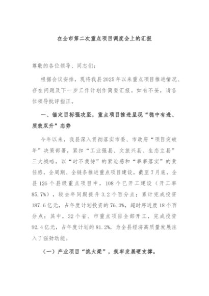/ 【七哥公文】2025年:在全市第二次重点项目调度会上的汇报+更多免费公文+VX:QiGeGongWen2024