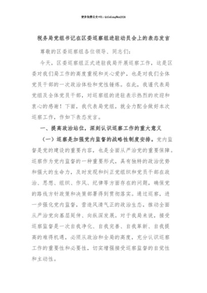【七哥公文】2025年:【七哥公文】税务局党组书记在区委巡察组进驻动员会上的表态发言+更多免费公文+VX:QiGeGongWen2024+更多免费公文+VX:QiGeGongWen2024