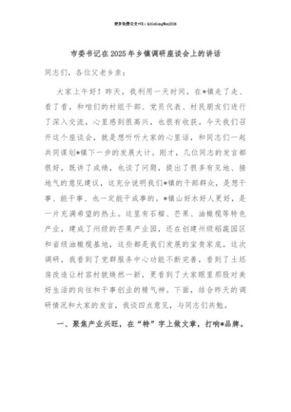 【七哥公文】2025年:【七哥公文】市委书记在2025年乡镇调研座谈会上的讲话+更多免费公文+VX:QiGeGongWen2024+更多免费公文+VX:QiGeGongWen2024