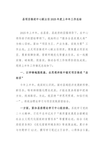 / 【七哥公文】2025年:县项目推进中心副主任2025年度上半年工作总结+更多免费公文+VX:QiGeGongWen2024