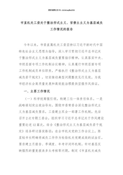 【七哥公文】2025年:【七哥公文】市直机关工委关于整治形式主义、官僚主主义为基层减负工作情况的报告+更多免费公文+VX:QiGeGongWen2024+更多免费公文+VX:QiGeGongWen2024