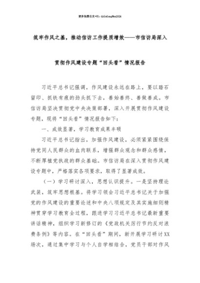 【七哥公文】2025年:【七哥公文】筑牢作风之基,推动信访工作提质增效——市信访局深入贯彻作风建设专题“回头看”情况报告+更多免费公文+VX:QiGeGongWen2024+更多免费公文+VX:QiGeGongWen2024