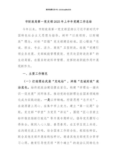 【七哥公文】2025年:【七哥公文】市财政局第一党支部2025年上半年党建工作总结+更多免费公文+VX:QiGeGongWen2024+更多免费公文+VX:QiGeGongWen2024