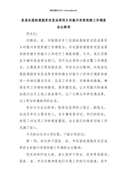 【七哥公文】2025年:【七哥公文】某县巩固拓展脱贫攻坚成果同乡村振兴有效衔接工作调度会主持词+更多免费公文+VX:QiGeGongWen2024+更多免费公文+VX:QiGeGongWen2024