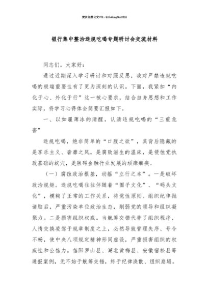 【七哥公文】2025年:【七哥公文】银行集中整治违规吃喝专题研讨会交流材料+更多免费公文+VX:QiGeGongWen2024+更多免费公文+VX:QiGeGongWen2024