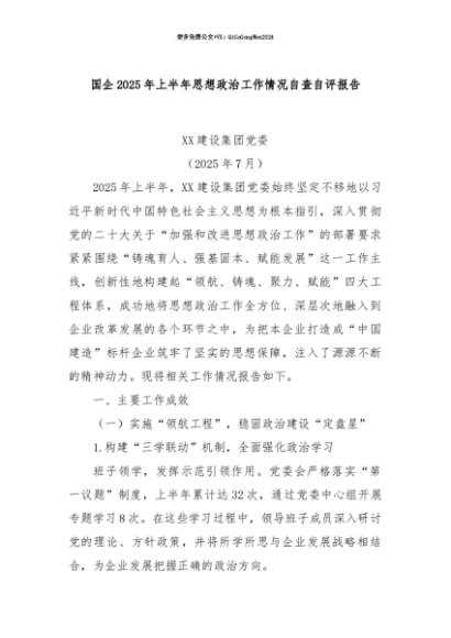 【七哥公文】2025年:【七哥公文】国企2025年上半年思想政治工作情况自查自评报告+更多免费公文+VX:QiGeGongWen2024+更多免费公文+VX:QiGeGongWen2024
