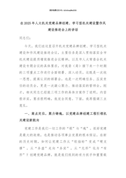 【七哥公文】2025年:【七哥公文】在2025年人大机关党建品牌创建、学习型机关建设暨作风建设推进会上的讲话+更多免费公文+VX:QiGeGongWen2024+更多免费公文+VX:QiGeGongWen2024
