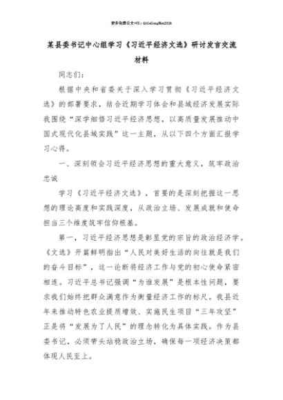 【七哥公文】2025年:【七哥公文】某县委书记中心组学习《总书记经济文选》研讨发言交流材料+更多免费公文+VX:QiGeGongWen2024+更多免费公文+VX:QiGeGongWen2024
