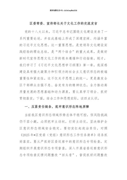 【七哥公文】2025年:【七哥公文】区委常委、宣传部长关于文化工作的交流发言+更多免费公文+VX:QiGeGongWen2024+更多免费公文+VX:QiGeGongWen2024