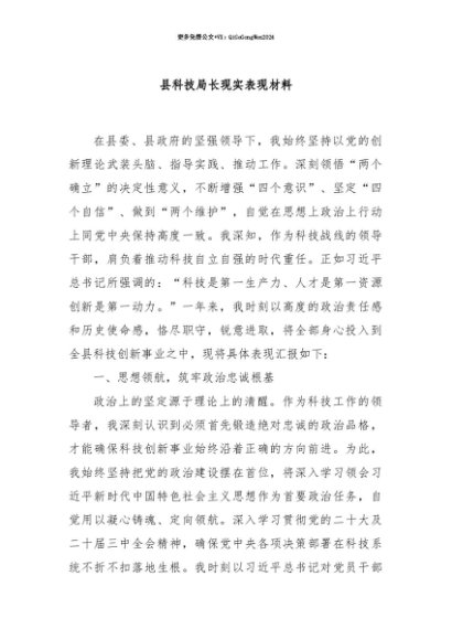 【七哥公文】2025年:【七哥公文】县科技局长现实表现材料+更多免费公文+VX:QiGeGongWen2024+更多免费公文+VX:QiGeGongWen2024