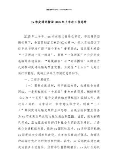 【七哥公文】2025年:【七哥公文】xx市交通运输局2025年上半年工作总结+更多免费公文+VX:QiGeGongWen2024+更多免费公文+VX:QiGeGongWen2024