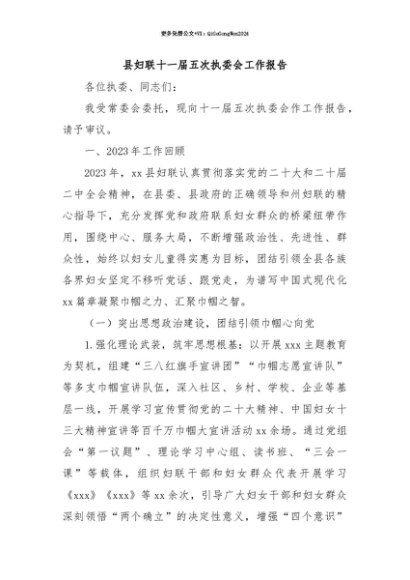 【七哥公文】2025年:【七哥公文】县妇联十一届五次执委会工作报告+更多免费公文+VX:QiGeGongWen2024+更多免费公文+VX:QiGeGongWen2024