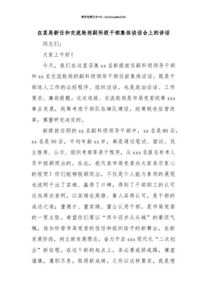 【七哥公文】2025年:【七哥公文】在某局新任和交流轮岗副科级干部集体谈话会上的讲话+更多免费公文+VX:QiGeGongWen2024+更多免费公文+VX:QiGeGongWen2024