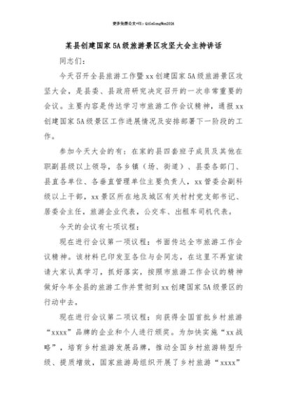【七哥公文】2025年:【七哥公文】某县创建国家5A级旅游景区攻坚大会主持讲话+更多免费公文+VX:QiGeGongWen2024+更多免费公文+VX:QiGeGongWen2024