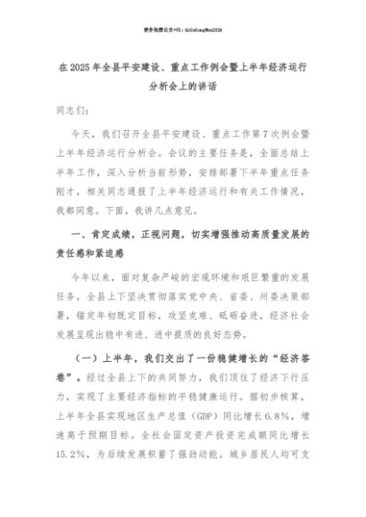 【七哥公文】2025年:【七哥公文】在2025年全县平安建设、重点工作例会暨上半年经济运行分析会上的讲话+更多免费公文+VX:QiGeGongWen2024+更多免费公文+VX:QiGeGongWen2024